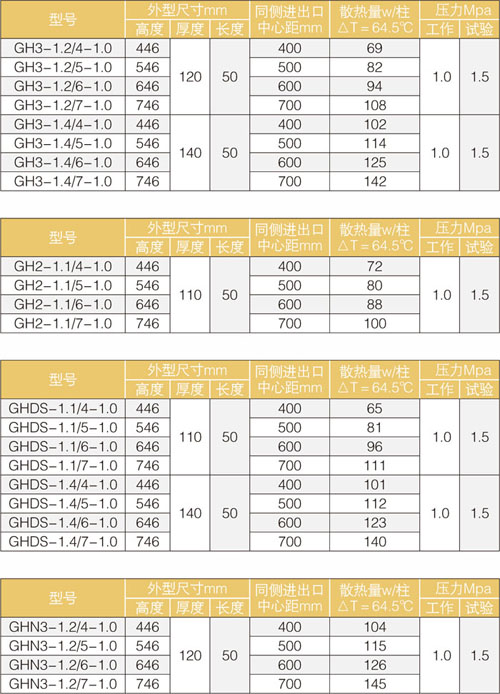 本產品分為4分管三柱、6分管三柱、6分管二柱、4分管單柱翅片管復合共四個品種。